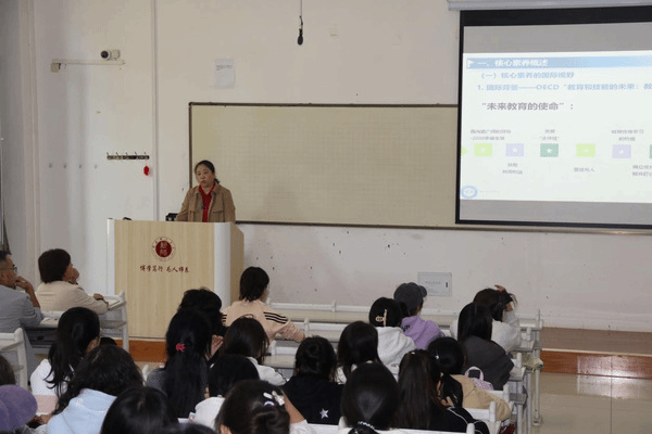 崔鸿教授从核心素养与教师职业道德两个方面开展讲座,为参会教师深刻阐述了新时代背景下核心素养对教师职业道德的要求。她首先详细讲述了国际视野下学生的核心素养的概念和组成,并根据中国学生发展核心素养特征,提出了核心素养对教师品格和能力方面的要求。随后,通过教师职业道德政策背景和典型案例分析,让参会人员深刻理解了“爱国守法、爱岗敬业、关爱学生、教书育人、为人师表、终身学习”的教师职业道德的含义和要求,并从国家、学校、教师、师范生不同层面提出了培养教师职业道德的路径。