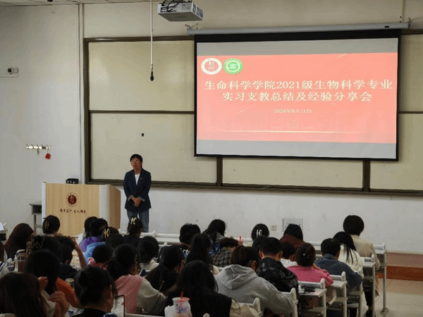 21-2班艾力主持,副院长刘彬教授、生物科学系主任张瑞老师进行讲话。以线下方式开展,21级优秀实习生代表及22级生命科学专业共计200余名老师、同学参加。在学院大力支持,教师及优秀实习生充分准备下,此次实习支教总结分享大会圆满成功。