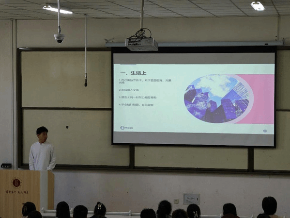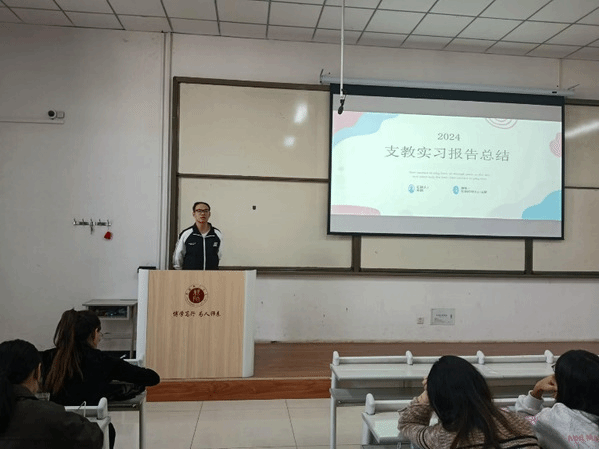 张明林同学从日常生活、教学工作两方面分享了他的支教经验。他表示,初上讲台,面对一双双求知若渴的眼睛,他感受到了前所未有的责任感和使命感。为了让孩子们更好地掌握知识,精心备课,尝试用生动有趣的教学方式激发他们的学习兴趣。课堂上,鼓励孩子们大胆发言,勇于表达自己的观点;课后,耐心辅导,帮助那些基础薄弱的同学追赶上来。渐渐地,他看到了孩子们成绩的进步,更看到了他们眼中闪烁的自信光芒。