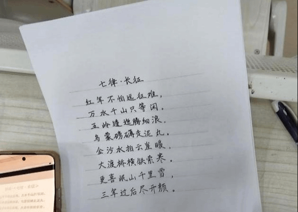 在钢笔字赛道当中,选手们用钢笔书写毛主席的《七律·长征》,这首诗具有深厚的历史文化内涵和崇高的革命精神。钢笔字作品整体风格多样,有的选手注重笔画的规整与挺拔,体现出钢笔书写的刚劲之美;有的则在字形结构上巧妙布局,使文字富有韵律感。在书写“红军不怕远征难”一句时,“红”字的绞丝旁书写流畅,“军”字的结构严谨,给人一种端庄大气的感觉。而“不怕”二字则通过笔画的轻重变化,展现出书写者的力度把握能力。