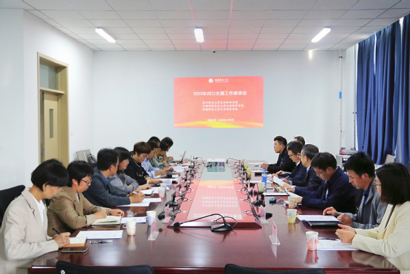的基本情况,并就对口支援共建需求及共建工作思路进行交流,臧建业院长、邱保胜院长分别介绍所在学校学院基本情况。双方围绕学科方向布局、科研团队建设、师范专业认证、人才培养、学生就业、实验室共建、实验设备捐赠及企业需求等对口支援共建事宜展开深入交流并达成共识。