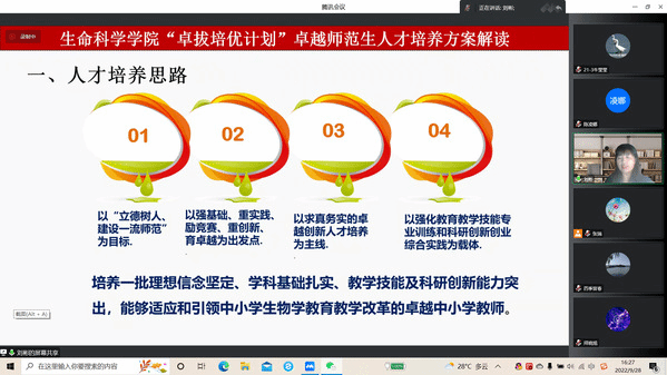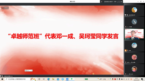 按工作计划顺利完成“卓越师范班”人才培养方案及实施办法的制定,完成卓越师范生的遴选及导师的选拔等工作。于2022年9月28日举行线上首届“卓越师范班”开班仪式,仪式由刘彬副院长主持,学校教务处处长孟繁胜、学院领导班子、各系室主任、卓越班导师、卓越师范生及2021级全体学生参加。