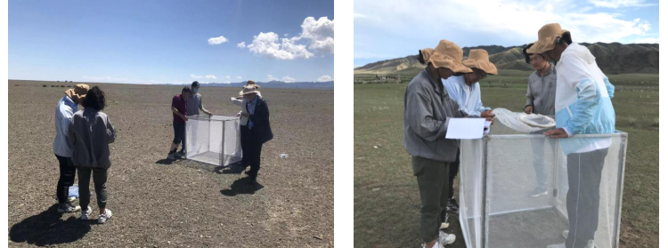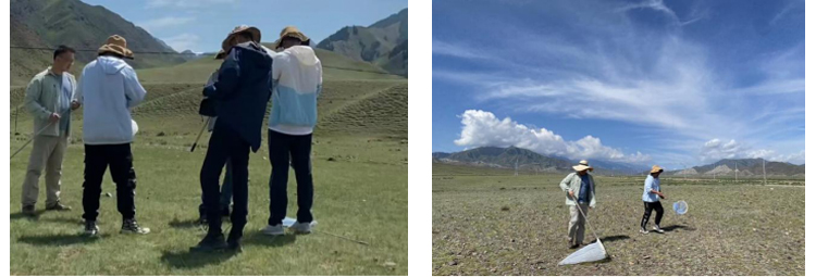 温泉县虫害普查现场技术培训(左:蝗虫种类识别右:扫网法的使用)
