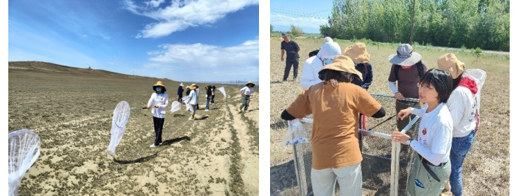 何岚老师教塔城市草原站阿娜尔(左)制作昆虫标本及团队制作好的标本(右)