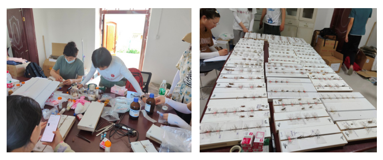 何岚老师教塔城市草原站阿娜尔(左)制作昆虫标本及团队制作好的标本(右)